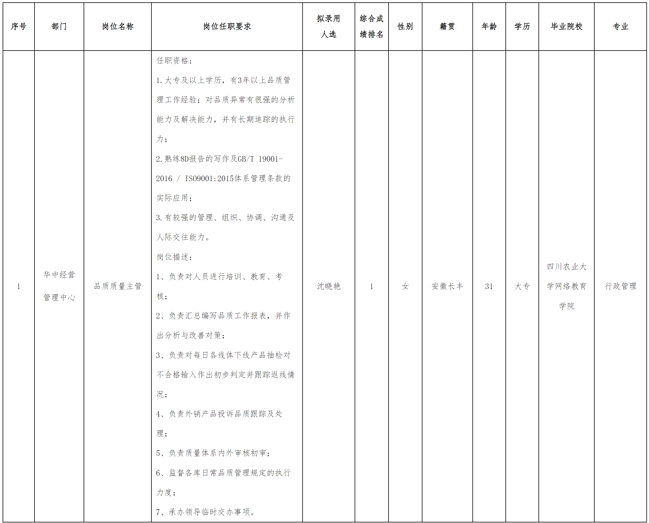 根據(jù)四川長虹民生物流股份有限公司發(fā)布的招聘公告及招聘相關(guān)規(guī)定,經(jīng)筆試、面試、考察、體檢等程序,擬錄用沈曉艷同志到華中經(jīng)營管理中心工作,現(xiàn)予以公示,具體情況如下: