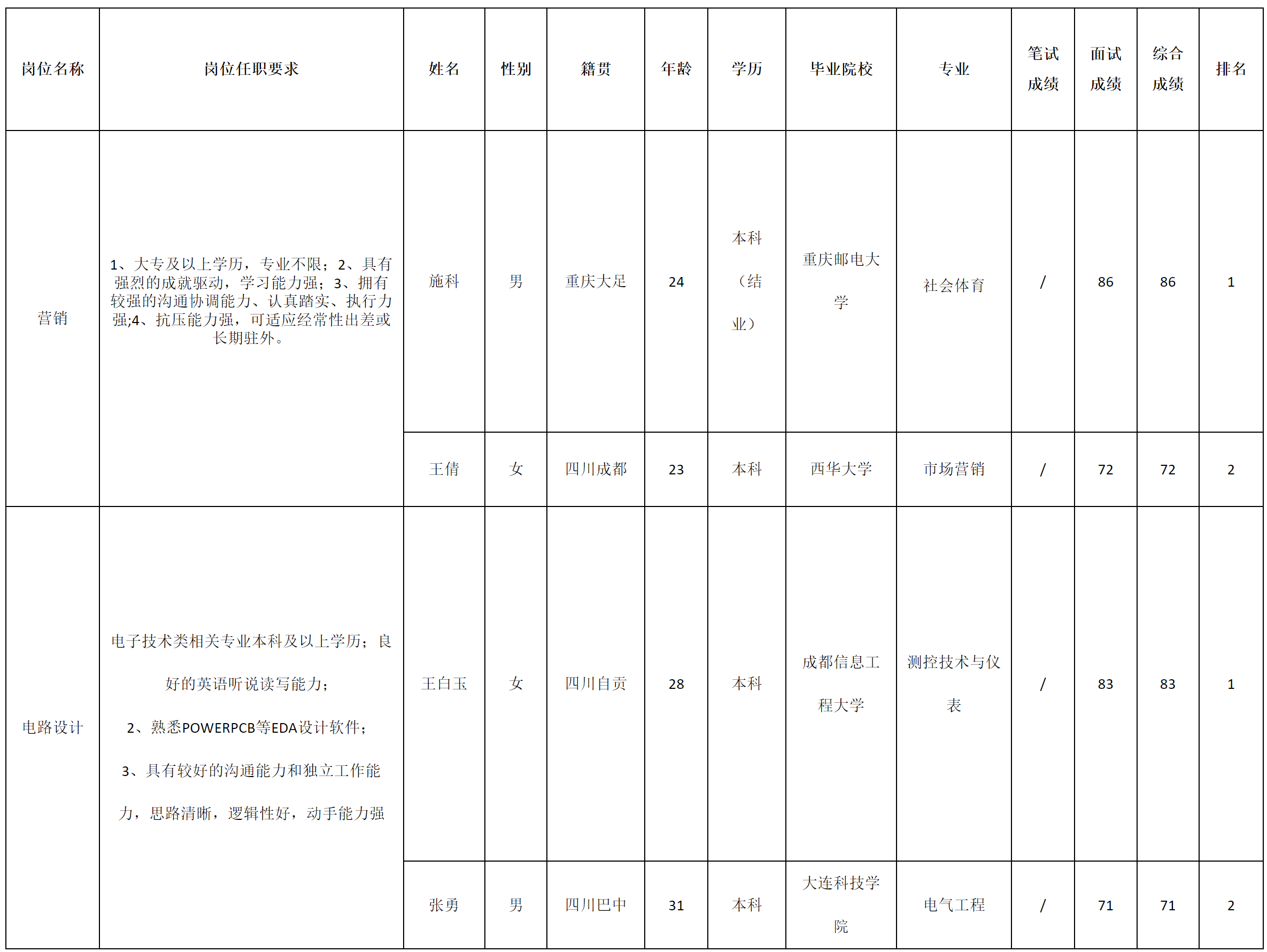 根據(jù)四川長(zhǎng)虹新網(wǎng)科技有限責(zé)任公司發(fā)布的招聘公告及招聘相關(guān)規(guī)定,經(jīng)筆試、面試等程序,現(xiàn)將筆試(面試)成績(jī)予以公示。