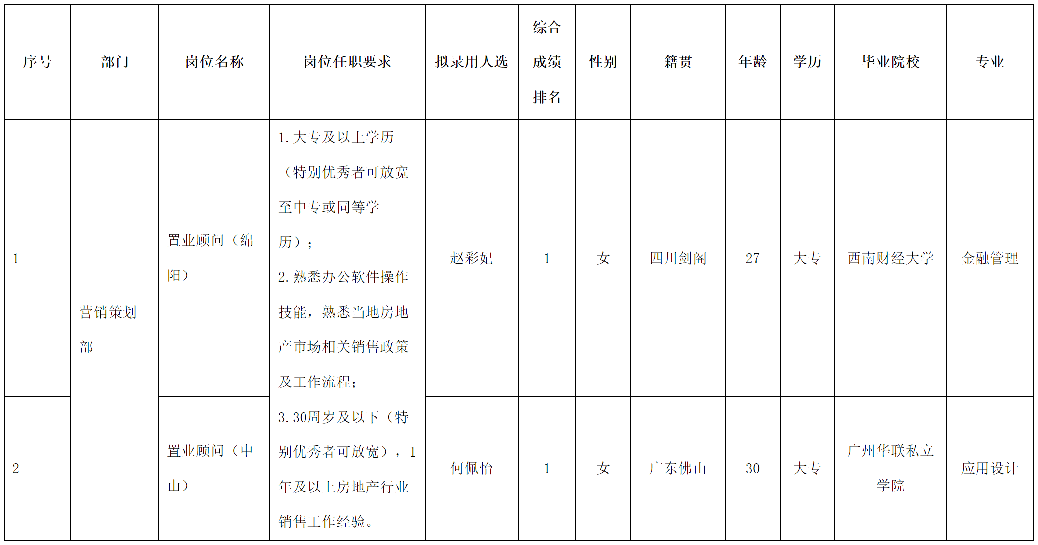 根據(jù)四川長(zhǎng)虹置業(yè)有限公司發(fā)布的招聘公告及招聘相關(guān)規(guī)定,經(jīng)筆試、面試、考察、體檢等程序,擬錄用趙彩妃同志、何佩怡同志到四川長(zhǎng)虹置業(yè)有限公司工作,現(xiàn)予以公示,具體情況如下: