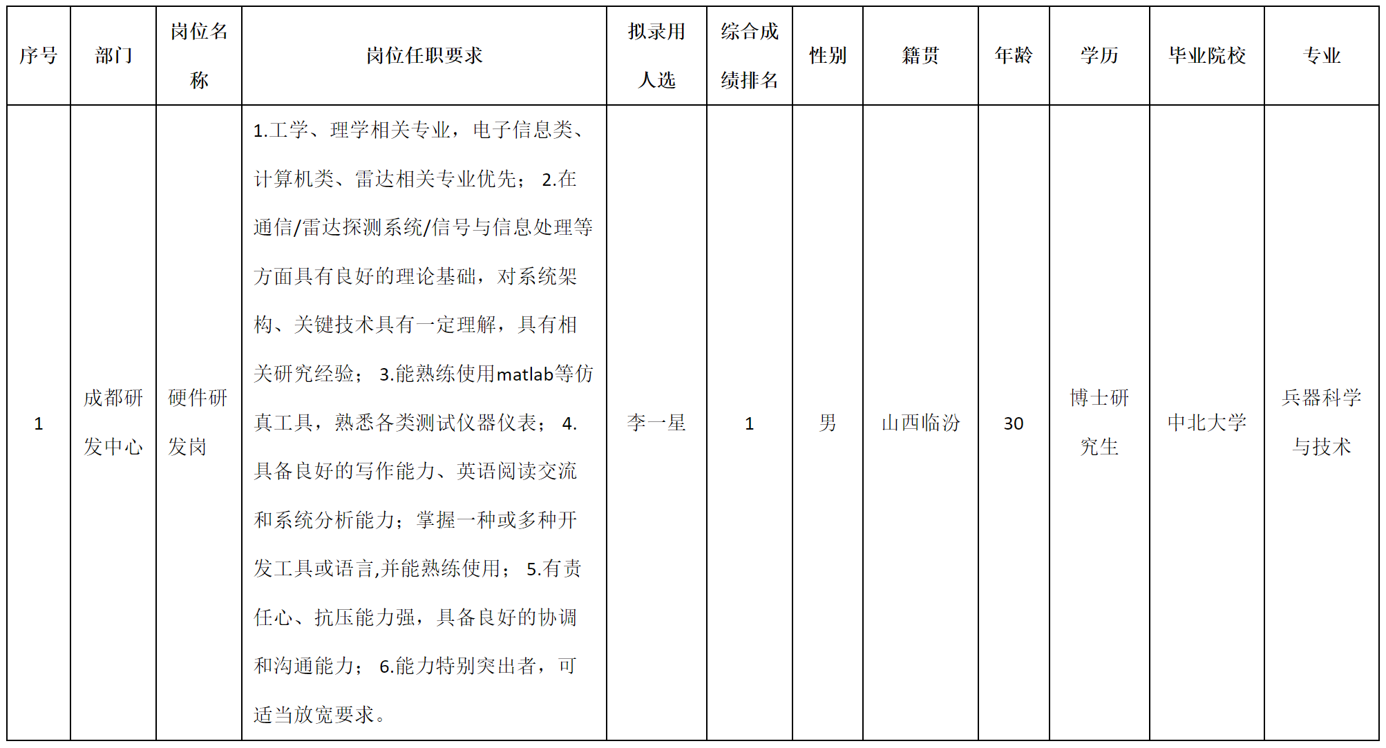 根據(jù)四川九州空管科技有限責(zé)任公司發(fā)布的招聘公告及招聘相關(guān)規(guī)定,經(jīng)筆試、面試、考察、體檢等程序,擬錄用李一星同志到四川九州空管科技有限責(zé)任公司工作,現(xiàn)予以公示,具體情況如下: