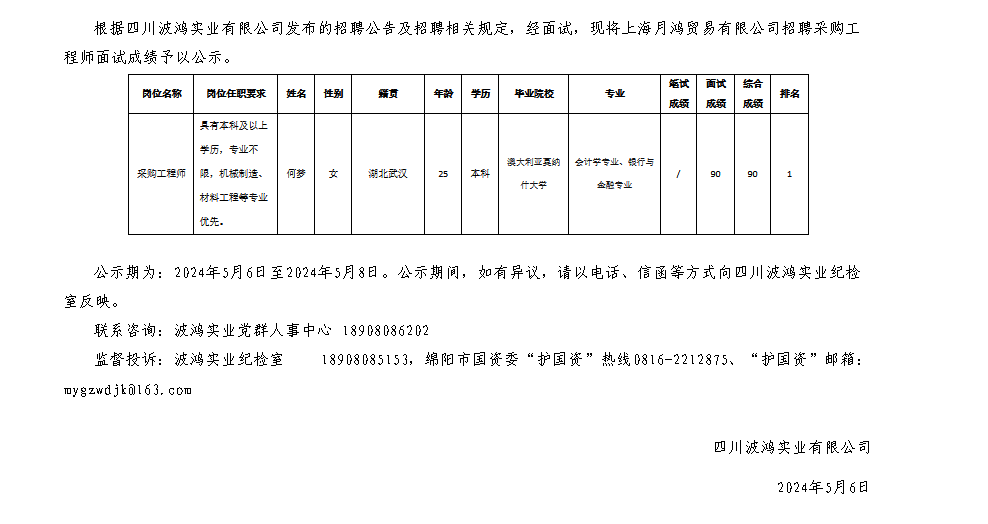 四川波鴻實(shí)業(yè)有限公司關(guān)于招聘上海月鴻貿(mào)易有限公司招聘采購(gòu)工程師測(cè)試成績(jī)的公示