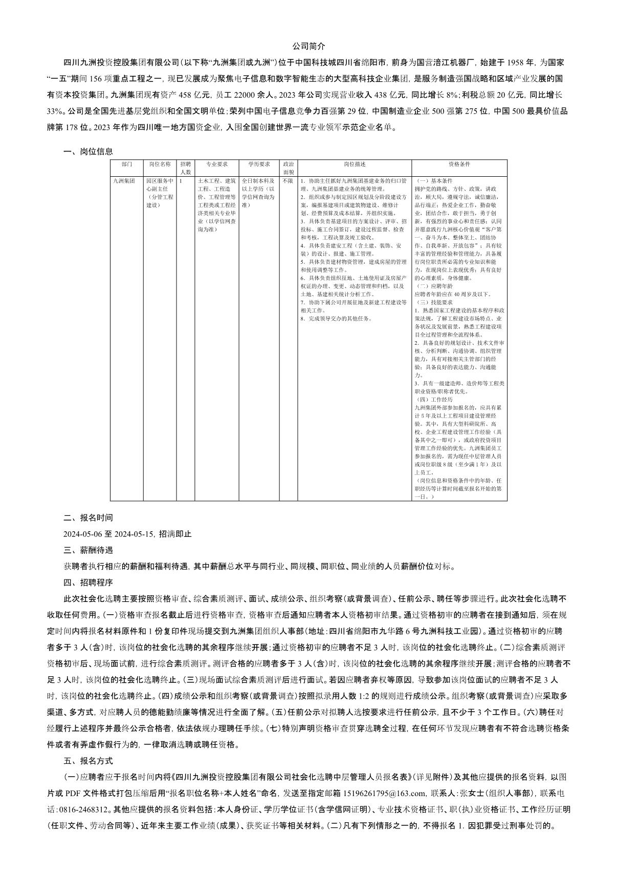 四川九洲投資控股集團(tuán)有限公司關(guān)于招聘中層管理人員的公告
