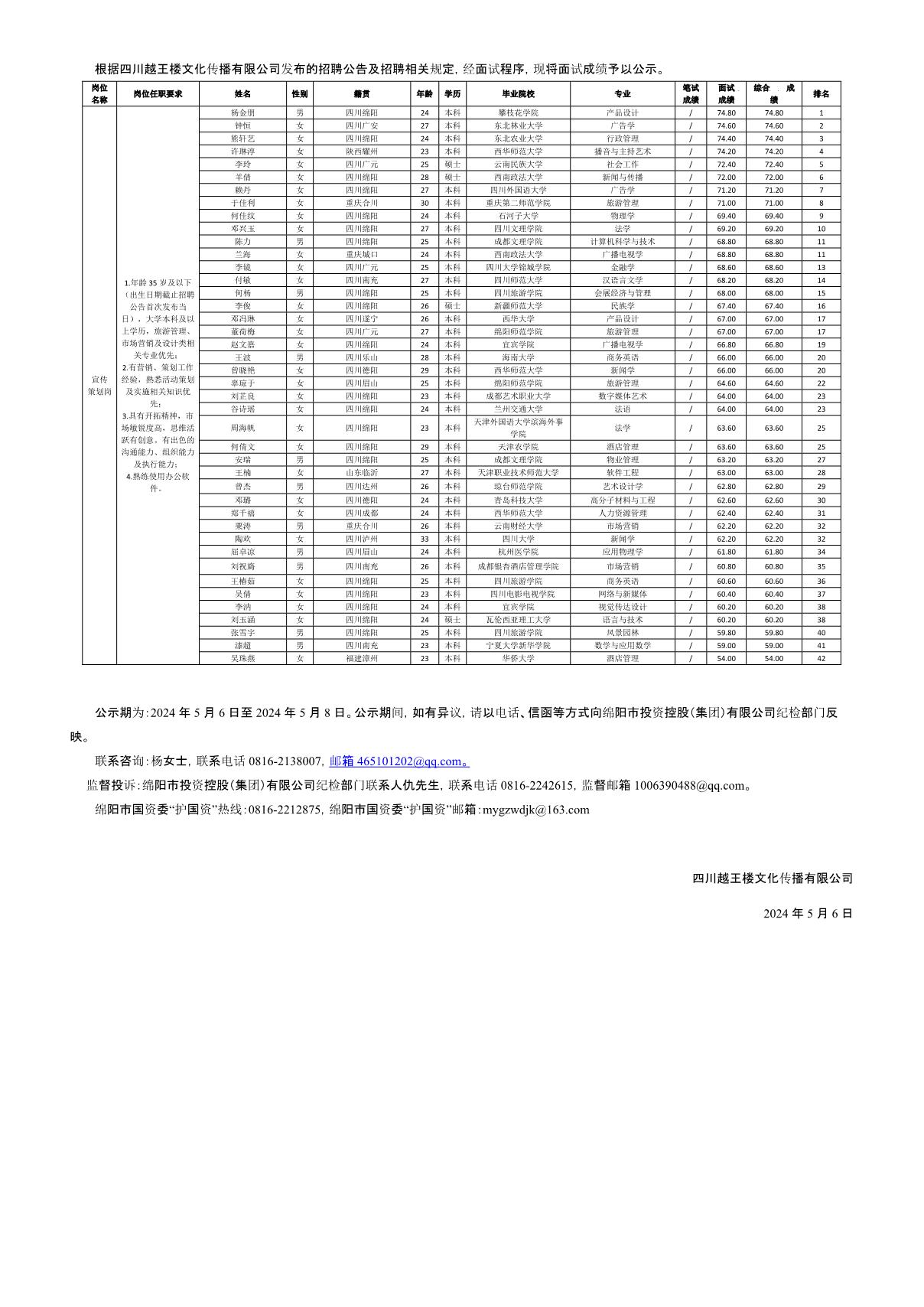 四川越王樓文化傳播有限公司關(guān)于招聘宣傳策劃崗位測(cè)試成績(jī)的公示