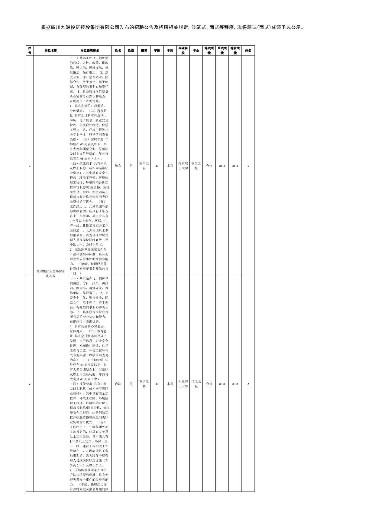 四川九洲投資控股集團(tuán)有限公司關(guān)于招聘中層管理人員測(cè)試成績(jī)的公示