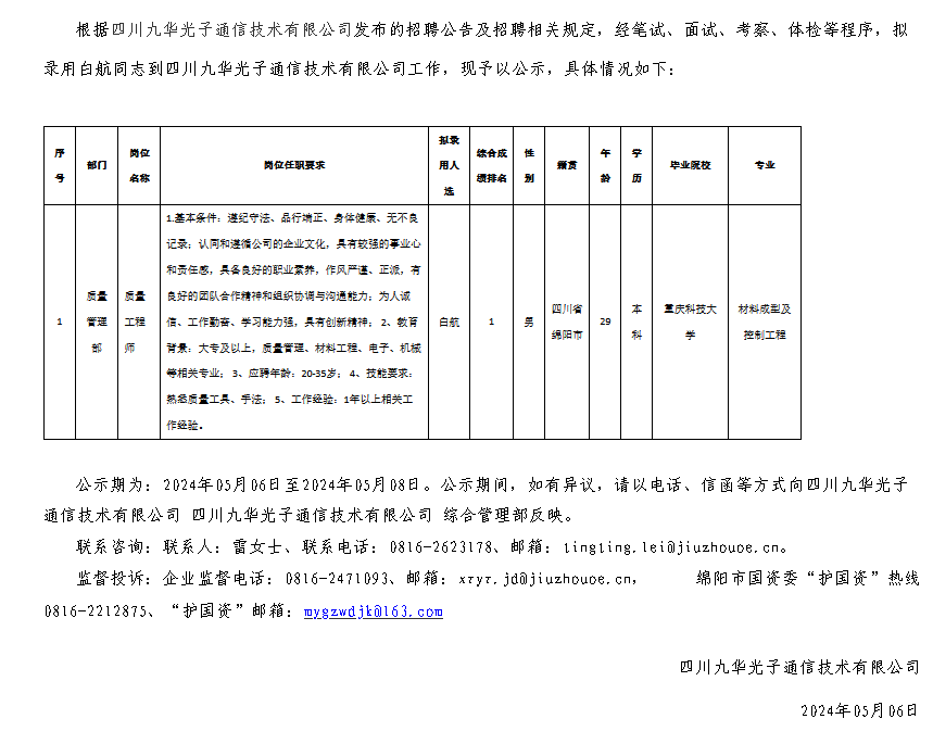 四川九華光子通信技術(shù)有限公司關(guān)于招聘質(zhì)量工程師擬錄用人員的公示