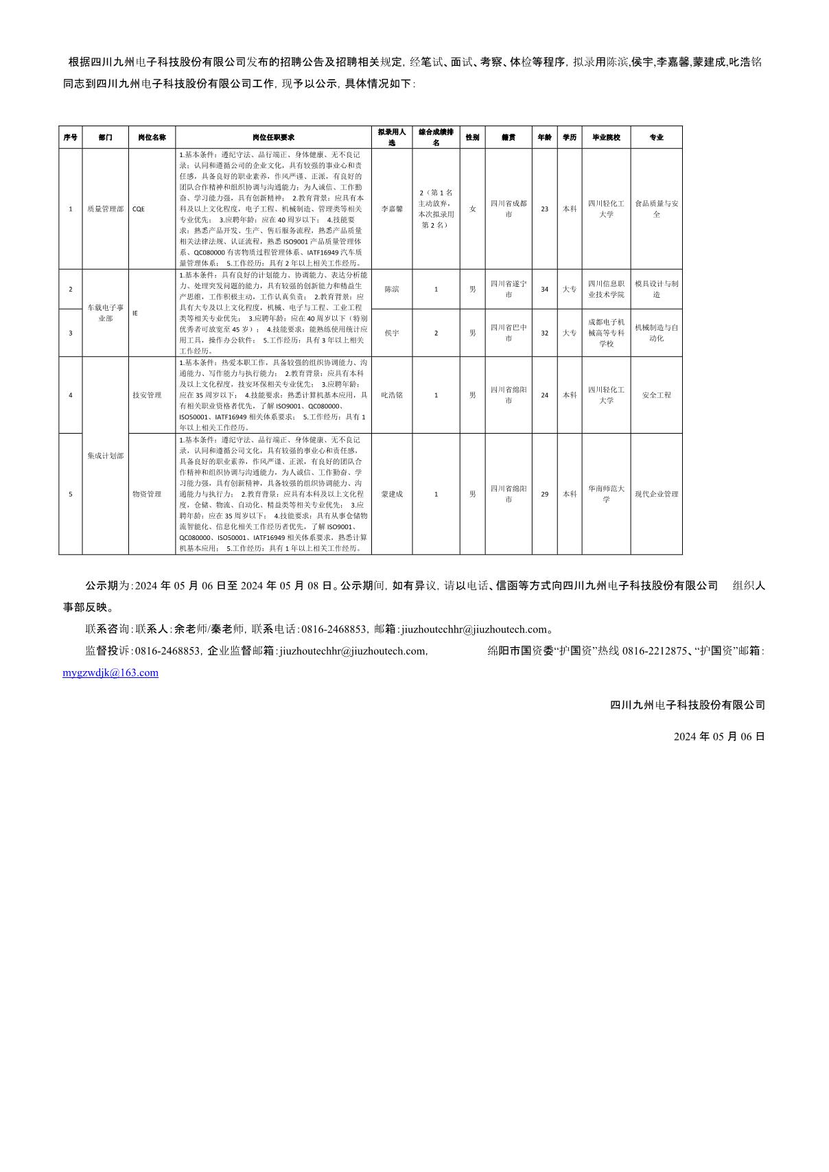四川九州電子科技股份有限公司關(guān)于招聘IE等崗位擬錄用人員的公示