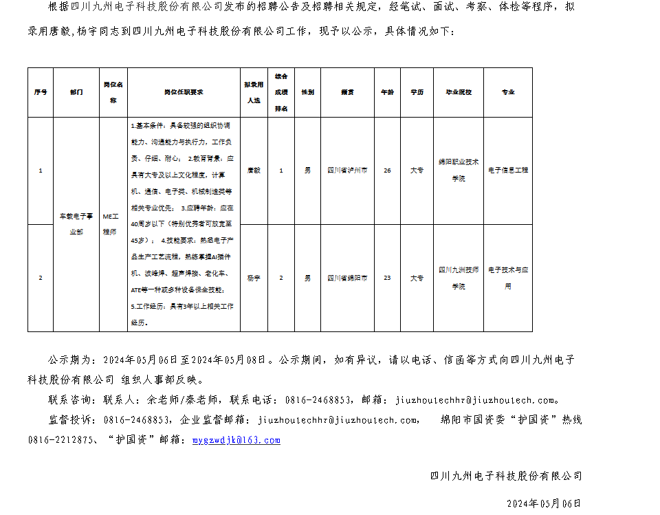 四川九州電子科技股份有限公司關(guān)于招聘ME工程師崗位擬錄用人員的公示