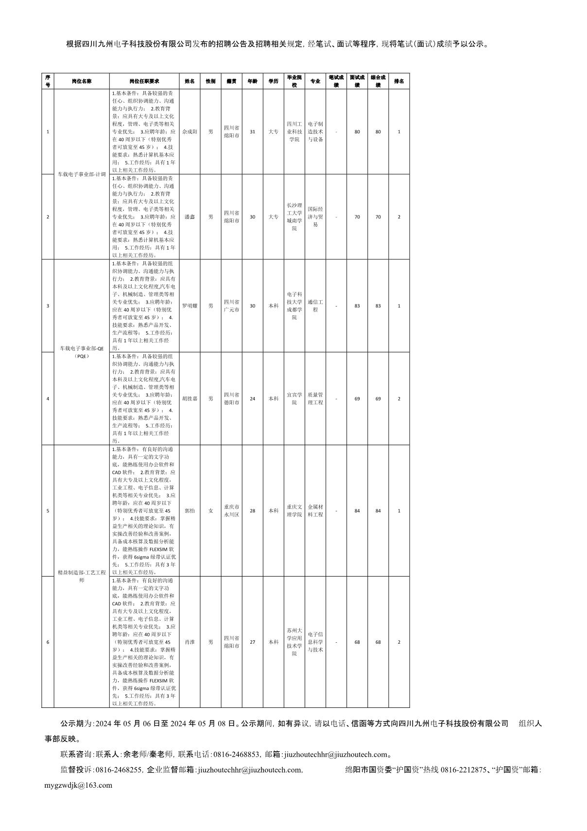 四川九州電子科技股份有限公司關(guān)于招聘QE(PQE)等崗位測(cè)試成績(jī)的公示