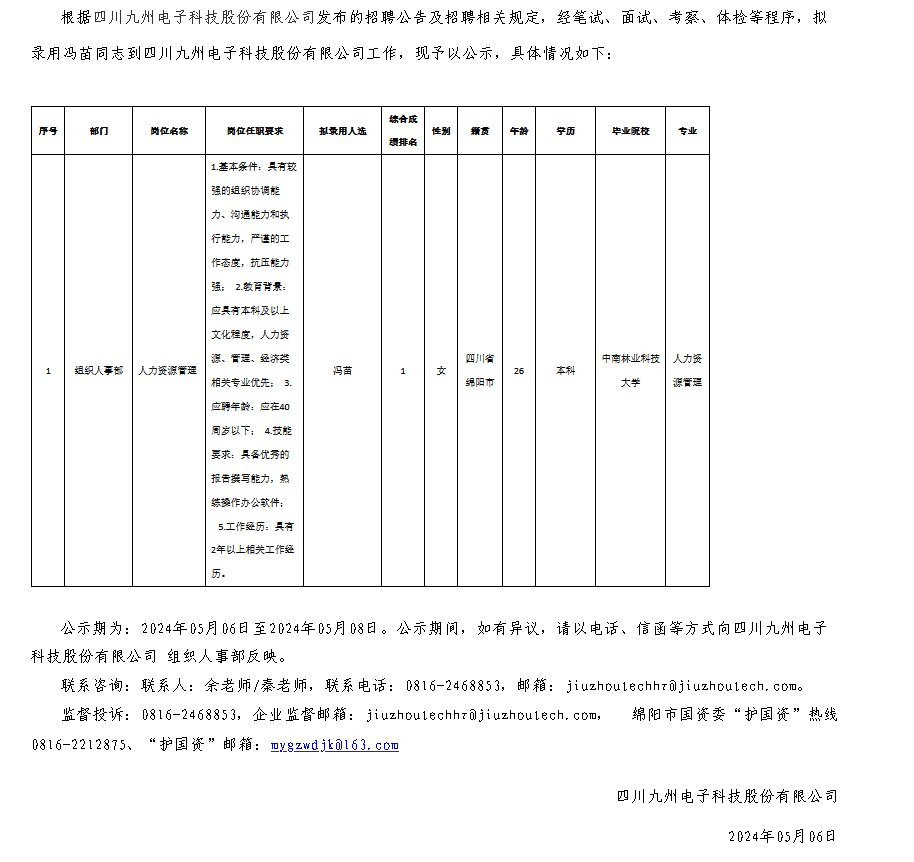 四川九州電子科技股份有限公司關于招聘人力資源管理擬錄用人員的公示