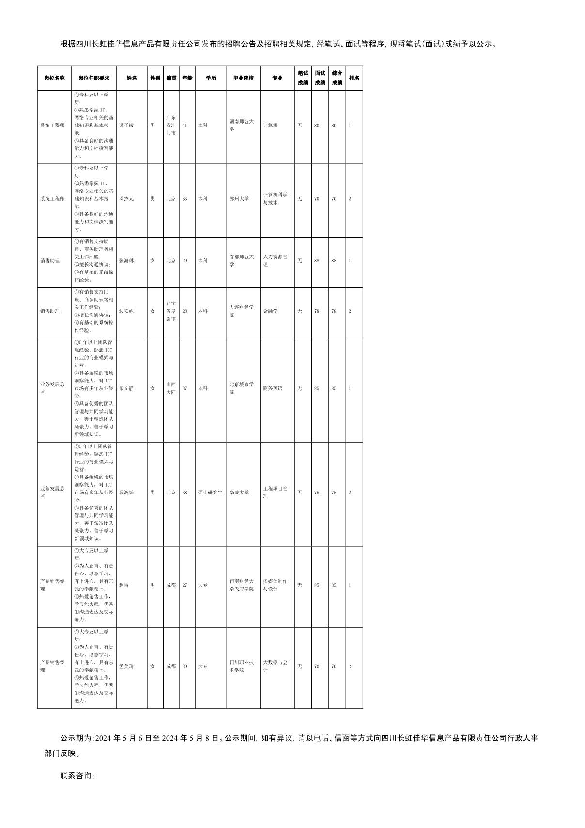 四川長虹佳華信息產(chǎn)品有限責(zé)任公司關(guān)于招聘系統(tǒng)工程師等崗位測試成績的公示
