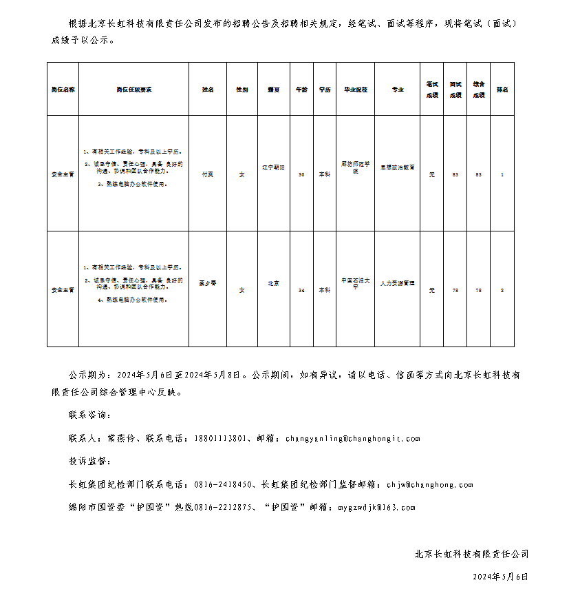 北京長虹有限責(zé)任公司關(guān)于招聘安全主管測試成績的公示