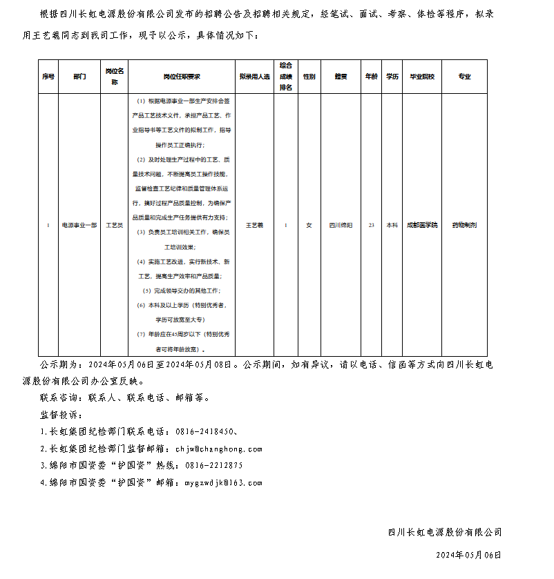 四川長虹電源股份有限公司關(guān)于招聘工藝員崗位擬錄用人員的公示