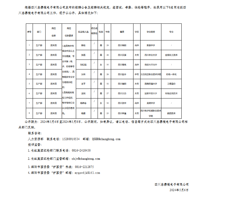 四川啟賽微電子有限公司關(guān)于招聘操作職員工擬錄用人員的公示