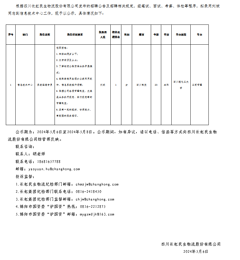 四川長虹民生物流股份有限公司關(guān)于招聘系統(tǒng)運維專員擬錄用人員的公示