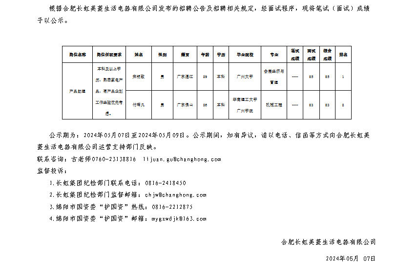 合肥長虹美菱生活電器有限公司關于招聘產(chǎn)品助理崗位測試成績的公示
