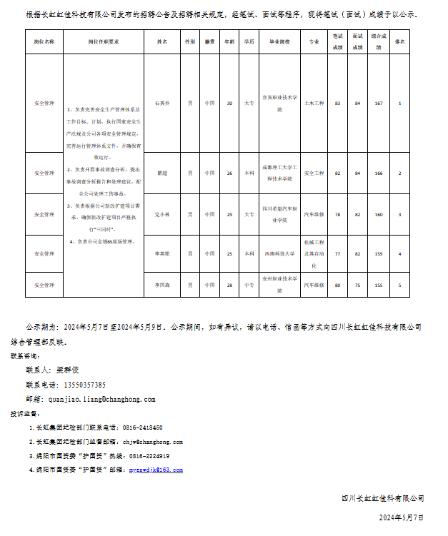 四川長虹虹佳科技有限公司關(guān)于招聘安全管理崗位測(cè)試成績的公示