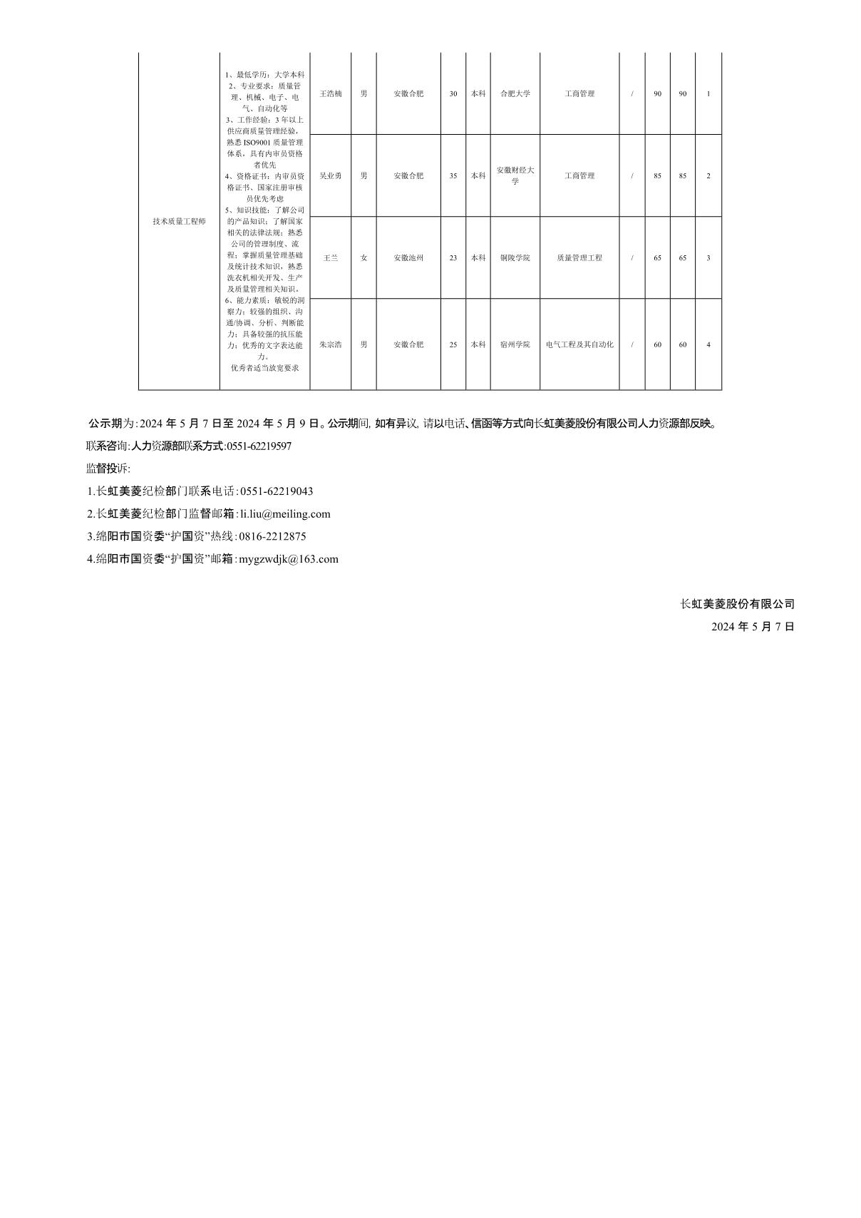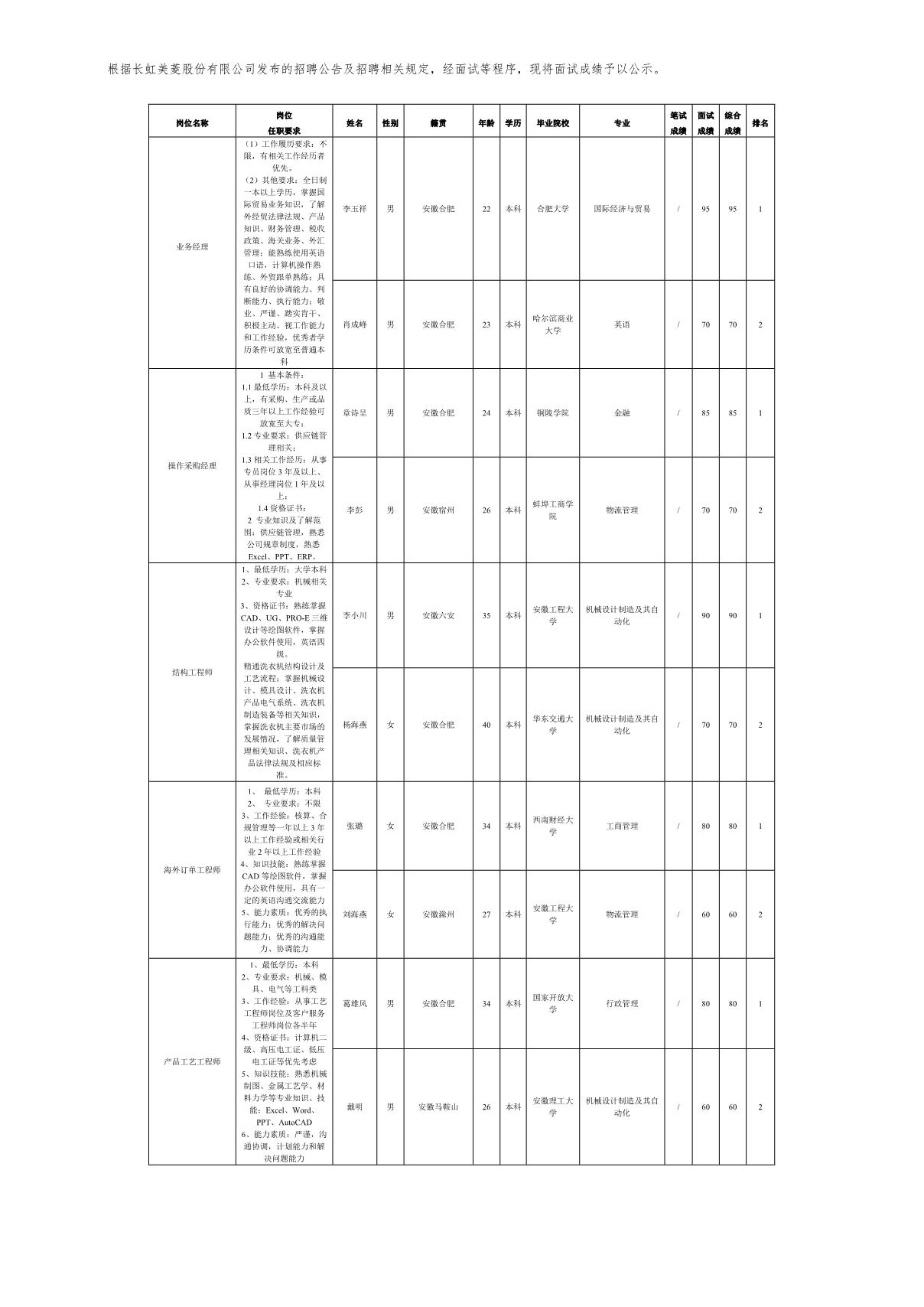 長(zhǎng)虹美菱股份有限公司關(guān)于招聘業(yè)務(wù)經(jīng)理等崗位測(cè)試成績(jī)的公示