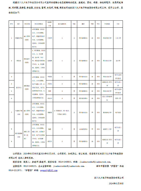 四川九州電子科技股份有限公司關(guān)于招聘財務(wù)管理(校招)等崗位擬錄用人員的公示