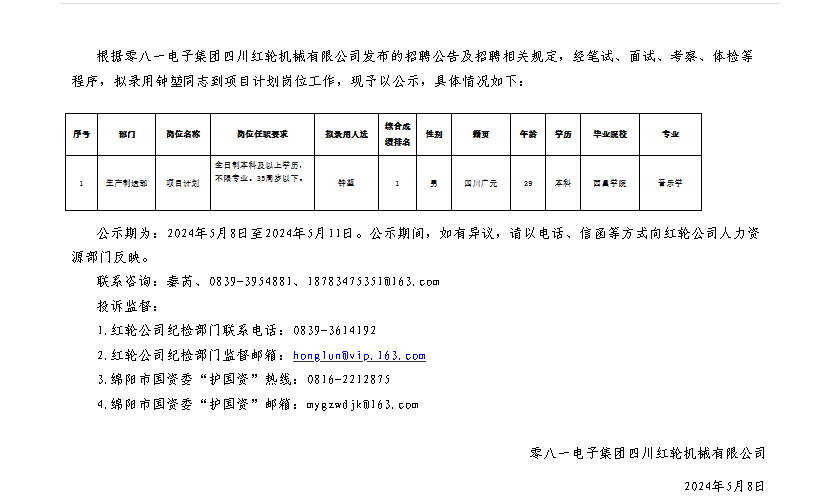 零八一電子集團(tuán)四川紅輪機(jī)械有限公司關(guān)于招聘項(xiàng)目計(jì)劃崗位擬錄用人員的公示