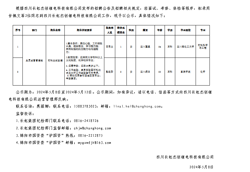 四川長虹杰創(chuàng)鋰電科技有限公司關(guān)于招聘操作職崗位擬錄用人員的公示