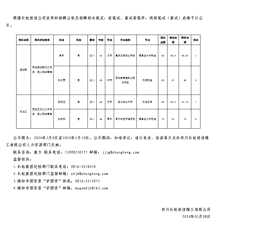 四川長虹技佳精工有限公司關(guān)于招聘線切割等崗位測試成績的公示