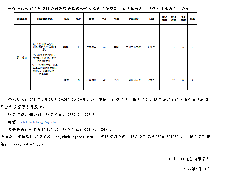 中山長虹電器有限公司關于招聘資產(chǎn)會計崗位測試成績的公示