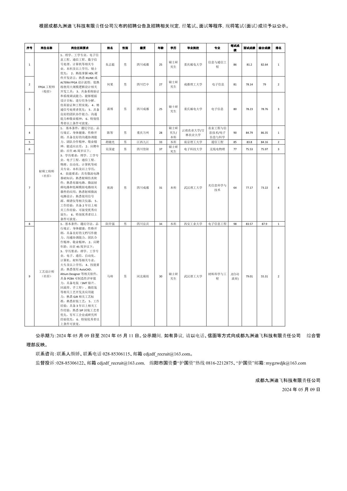 成都九洲迪飛科技有限責任公司關于招聘FPGA工程師等崗位測試成績的公示