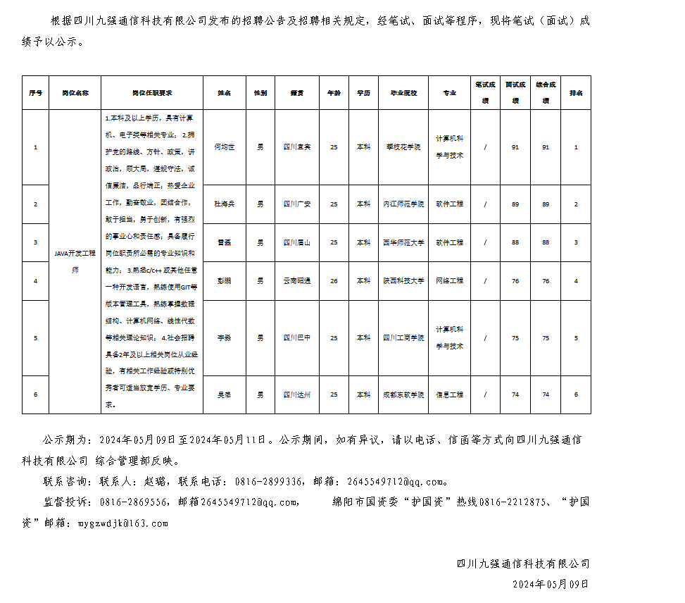 四川九強(qiáng)通信科技有限公司關(guān)于招聘JAVA開發(fā)工程師測試成績的公示