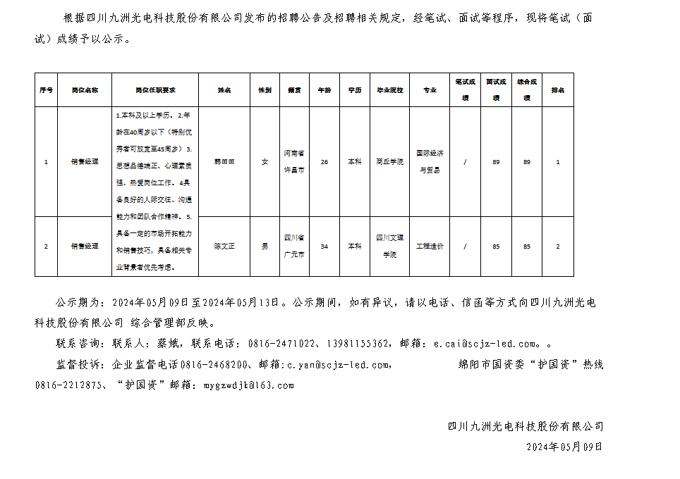 四川九洲光電科技股份有限公司關(guān)于招聘銷售經(jīng)理崗位測(cè)試成績(jī)的公示