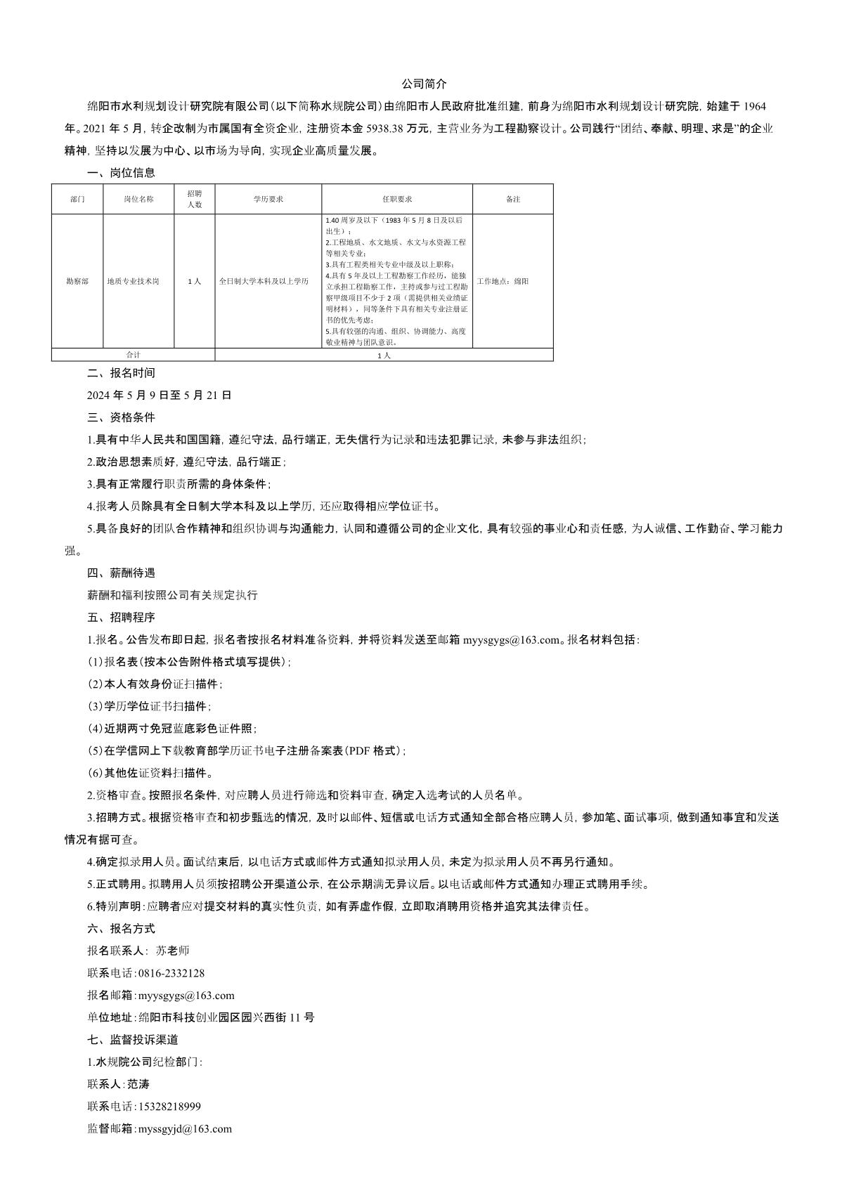 綿陽市水利規(guī)劃設(shè)計(jì)研究院有限公司關(guān)于招聘地質(zhì)專業(yè)技術(shù)崗位的公告