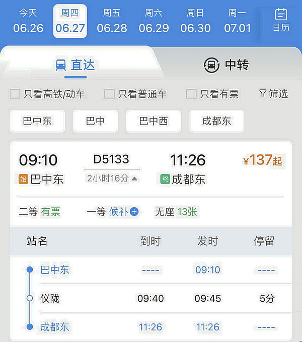 首發(fā)動(dòng)車將于6月27日9:10分從巴中開出,只經(jīng)停儀隴一站,11:26分抵達(dá)成都。