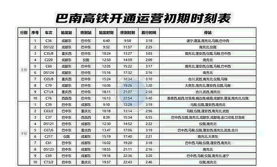 巴南高鐵開通運(yùn)營(yíng)初期時(shí)刻表 圖據(jù)西南鐵路