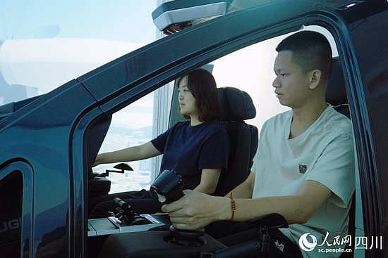 記者在AE200型“飛行汽車”模擬艙內(nèi)進(jìn)行體驗(yàn)。人民網(wǎng) 趙祖樂攝