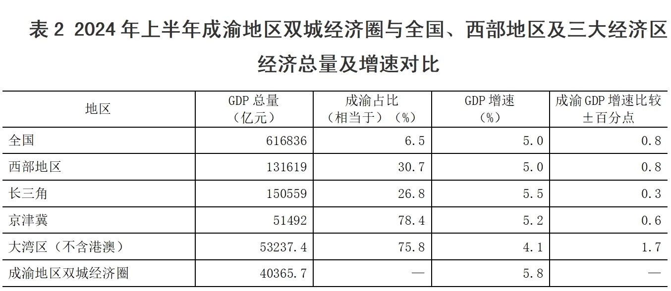 追趕發(fā)展步伐穩(wěn)健。上半年成渝地區(qū)雙城經(jīng)濟(jì)圈經(jīng)濟(jì)總量相當(dāng)于京津冀、大灣區(qū)(不含港澳)、長三角的78.4%、75.8%、26.8%,均高于上年同期、高于一季度,與三大經(jīng)濟(jì)區(qū)的差距持續(xù)縮小;經(jīng)濟(jì)增速比大灣區(qū)(不含港澳)、京津冀、長三角分別高1.7個(gè)、0.6個(gè)、0.3個(gè)百分點(diǎn)。