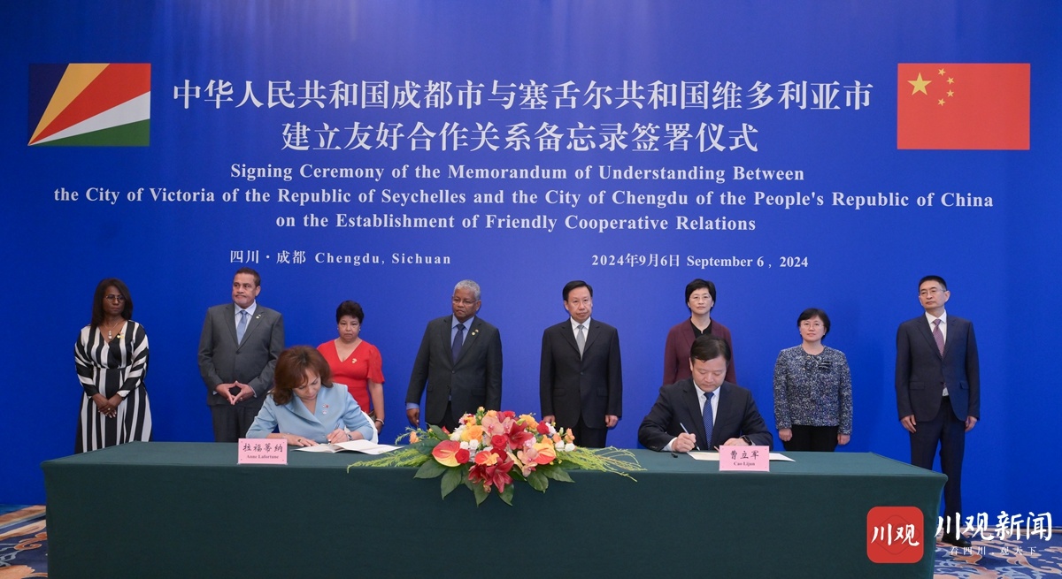 隨后,省委常委、成都市委書記曹立軍和塞舌爾駐華大使拉福蒂納分別代表雙方簽署《中華人民共和國成都市與塞舌爾共和國維多利亞市建立友好合作關(guān)系備忘錄》。