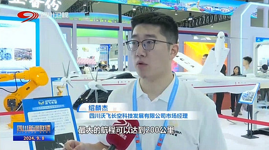 四川沃飛長(zhǎng)空科技發(fā)展有限公司市場(chǎng)經(jīng)理 紹麟杰:最大的航程可以達(dá)到200公里,最快的速度可以達(dá)到248公里每小時(shí),未來(lái)的應(yīng)用領(lǐng)域,主要運(yùn)用在城際之間的接駁服務(wù)、短途的旅游觀光。