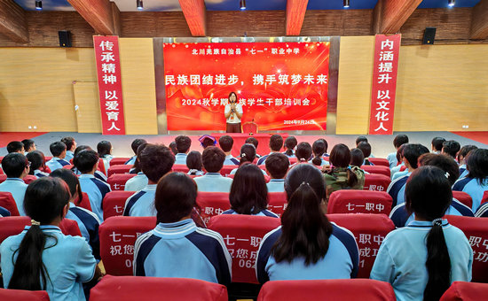 綿陽(yáng)新聞網(wǎng)訊 為了進(jìn)一步深化民族團(tuán)結(jié)進(jìn)步教育,全面提升學(xué)生干部的綜合素質(zhì)與能力,培養(yǎng)更多優(yōu)秀的民族學(xué)生干部,9月26日,北川羌族自治縣“七一”職業(yè)中學(xué)在學(xué)術(shù)報(bào)告廳舉行了以“民族團(tuán)結(jié)進(jìn)步,攜手筑夢(mèng)未來(lái)”為主題的2024年秋學(xué)生干部培訓(xùn)會(huì)。培訓(xùn)會(huì)由德育處副主任嚴(yán)福琴主持,黨總支專職副書(shū)記沈譽(yù)晗主講。學(xué)生管理公司、民族聯(lián)誼會(huì)、校團(tuán)委、國(guó)旗隊(duì)、管理公司宿管部所有干部參加培訓(xùn)。