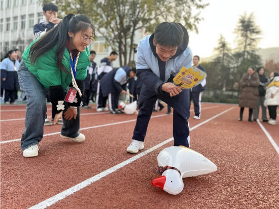 活動中,有的同學步伐靈活,巧妙用腳控制著“鴨子”的行進方向;有的同學與隊友默契配合,通過快速的傳遞和接應,讓“鴨子”在隊伍間有序穿梭;有的同學在加油助威聲中奮起直追,展現(xiàn)出堅韌不拔的毅力和團結協(xié)作的精神。同學們齊聲吶喊,整個操場充滿了歡聲笑語,吶喊聲、歡笑聲交織在一起,奏響了一曲青春的樂章。