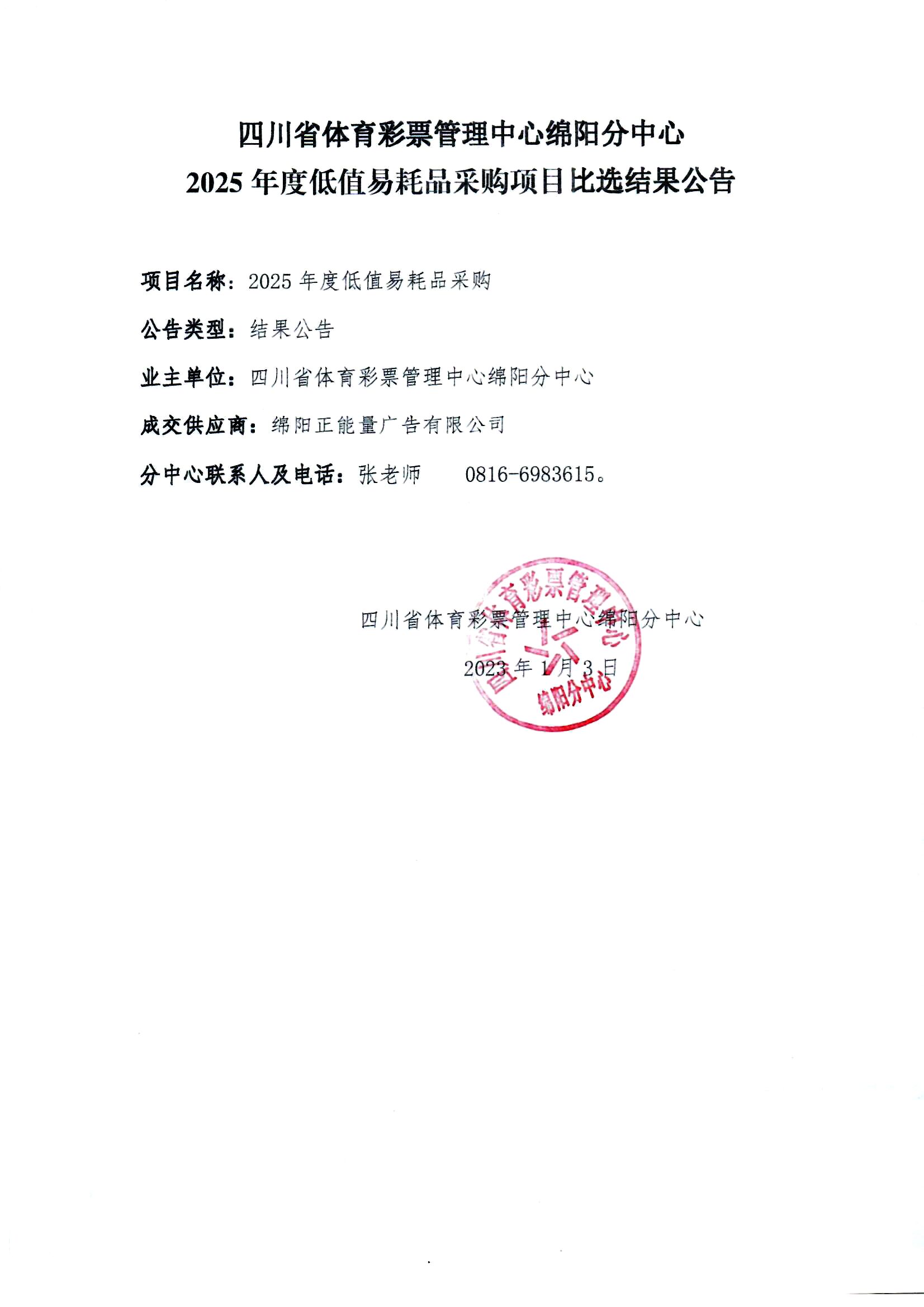 四川省體育彩票管理中心綿陽分中心2025年度低值易耗品采購項日比選結(jié)果公告