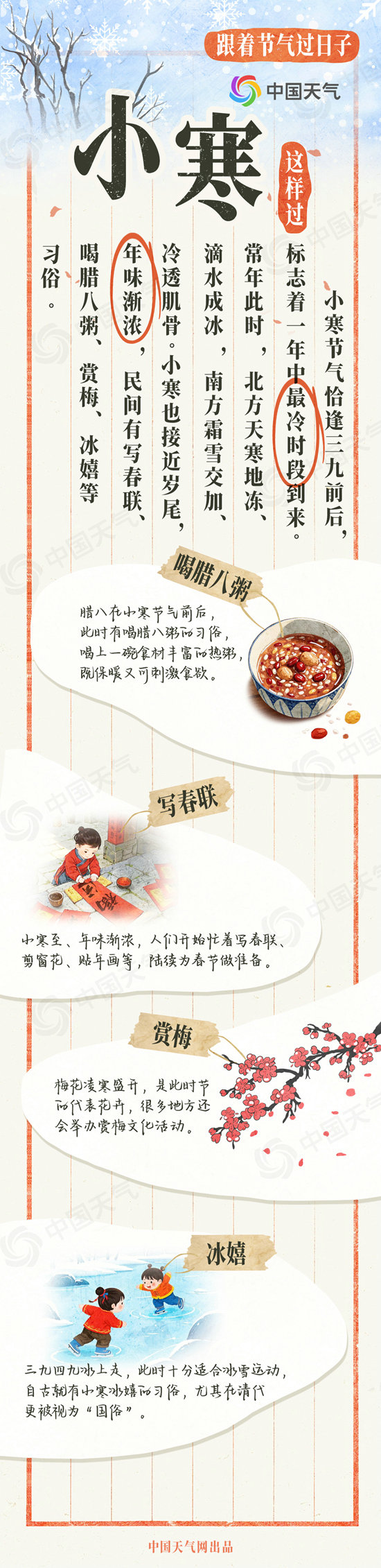 春生夏長(zhǎng),秋收冬藏,跟著節(jié)氣過日子,今天(1月5日)進(jìn)入冬天的第五個(gè)節(jié)氣——小寒。小寒節(jié)氣恰逢三九前后,標(biāo)志著一年之中最寒冷的時(shí)段到來。小寒也接近歲尾,年味漸濃,民間有寫春聯(lián)、喝臘八粥、賞梅、冰嬉等習(xí)俗。中國(guó)天氣網(wǎng)推出小寒風(fēng)俗圖鑒和小寒全國(guó)天氣地圖,看看這個(gè)節(jié)氣怎么過。