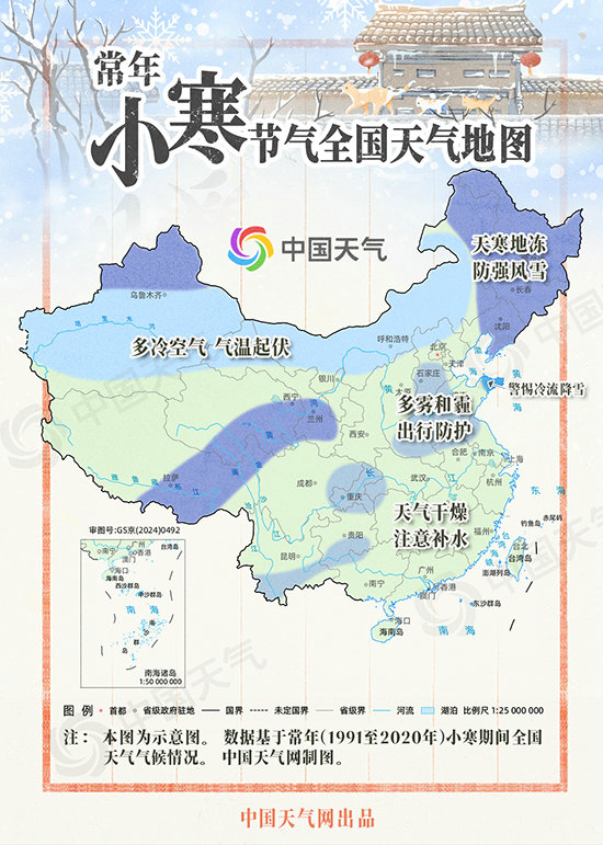 從中國(guó)天氣網(wǎng)推出的常年小寒節(jié)氣全國(guó)天氣地圖可以看出,小寒期間,冷空氣十分活躍,北方大部地區(qū)氣溫在冰點(diǎn)之下,可謂天寒地凍,尤其是新疆北部、東北地區(qū)和山東半島、青藏高原等地還可能出現(xiàn)強(qiáng)風(fēng)雪天氣,大家出行要做好防寒保暖措施,戴好手套、帽子、圍巾等裝備,謹(jǐn)防凍傷。