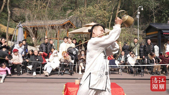 除了舞獅和變臉,長(zhǎng)嘴壺茶藝也成為了此次非遺活動(dòng)中的一大亮點(diǎn)。只見(jiàn)茶藝師手持長(zhǎng)嘴壺,精準(zhǔn)地控制水流,沖泡出一杯杯香醇的茶湯。這一技藝不僅展示了中國(guó)傳統(tǒng)茶文化的深厚底蘊(yùn),也讓游客們?cè)谄奋啵惺艿搅朔沁z文化的獨(dú)特韻味。