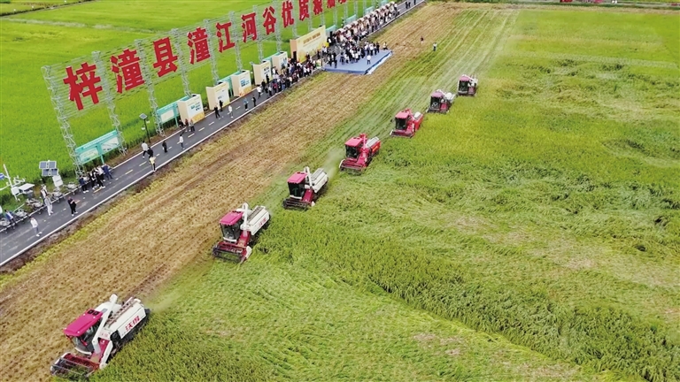 在梓潼潼江河谷優(yōu)質(zhì)糧油現(xiàn)代農(nóng)業(yè)園區(qū),聯(lián)合收割機(jī)在稻田里來(lái)回穿梭,切割、脫粒、篩選等工序一氣呵成。