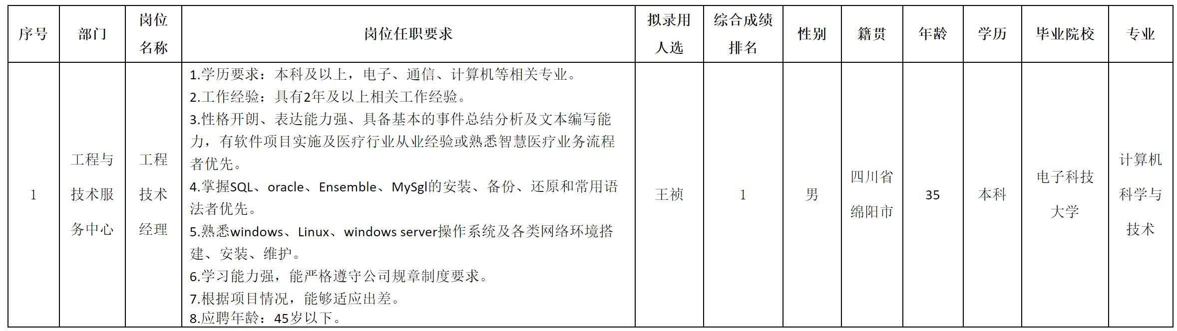根據(jù)四川長虹智慧健康科技有限公司發(fā)布的招聘公告及招聘相關(guān)規(guī)定,經(jīng)測試,擬錄用王禎同志到工程與技術(shù)服務(wù)中心工作,現(xiàn)予以公示,具體情況如下:
