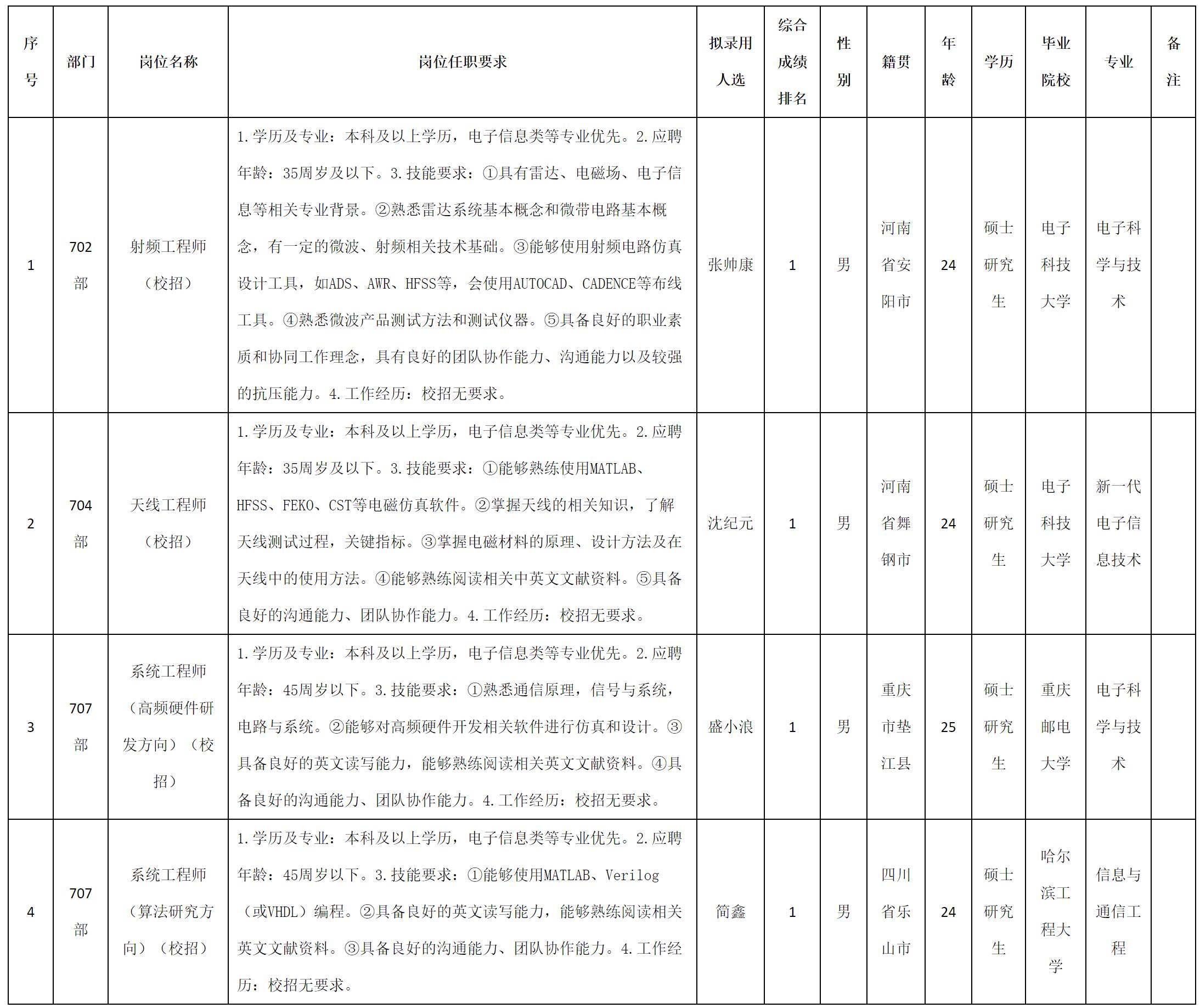 根據(jù)四川九洲電器集團(tuán)有限責(zé)任公司發(fā)布的招聘公告及招聘相關(guān)規(guī)定,經(jīng)測(cè)試、考察、體檢等程序,擬錄用張帥康等4名同志到四川九洲電器集團(tuán)有限責(zé)任公司工作,現(xiàn)予以公示,具體情況如下:
