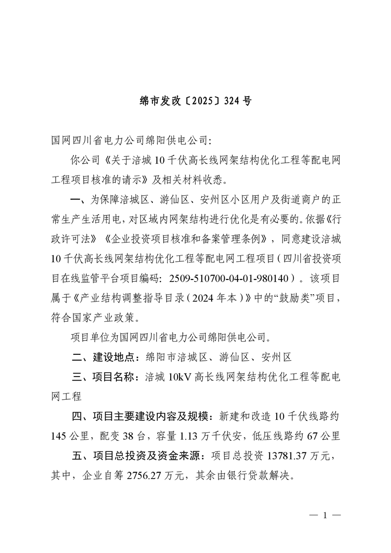綿陽市發(fā)展和改革委員會關(guān)于涪城10千伏高長線網(wǎng)架結(jié)構(gòu)優(yōu)化工程等配電網(wǎng)工程項目核準(zhǔn)的批復(fù)