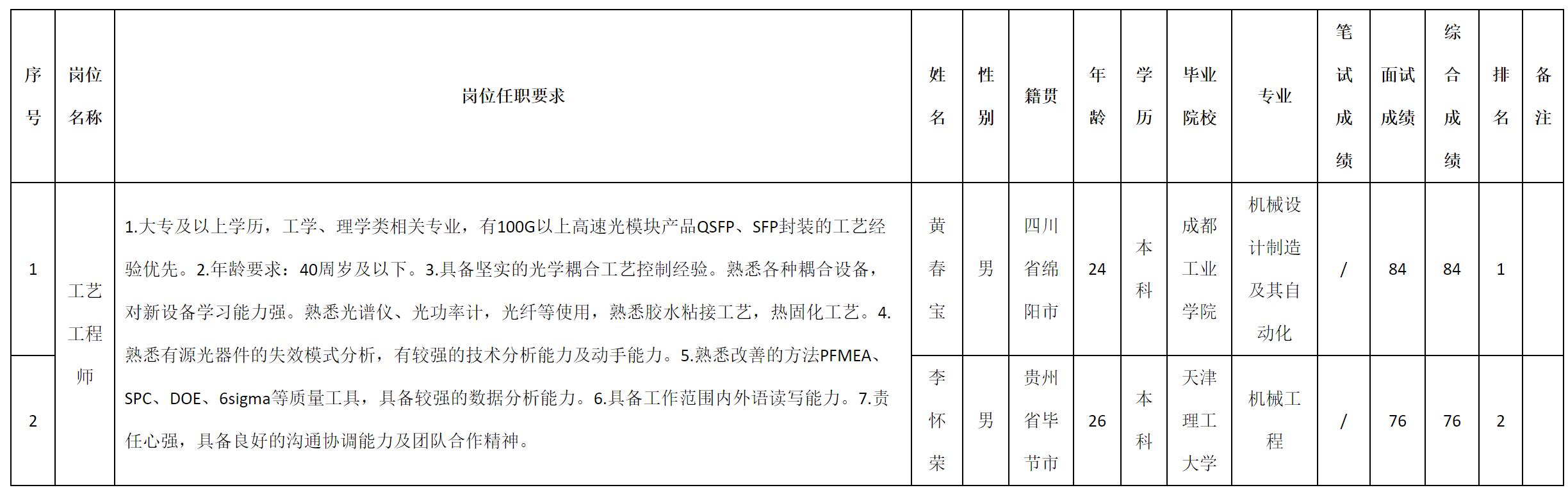 根據(jù)四川九華光子通信技術(shù)有限公司發(fā)布的招聘公告及招聘相關(guān)規(guī)定,現(xiàn)將測(cè)試成績(jī)予以公示。