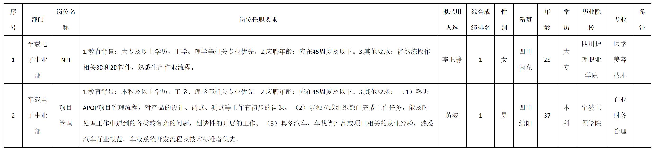 根據(jù)四川九州電子科技股份有限公司發(fā)布的招聘公告及招聘相關(guān)規(guī)定,經(jīng)測試、考察、體檢等程序,擬錄用李衛(wèi)靜等2名同志到四川九州電子科技股份有限公司工作,現(xiàn)予以公示,具體情況如下: