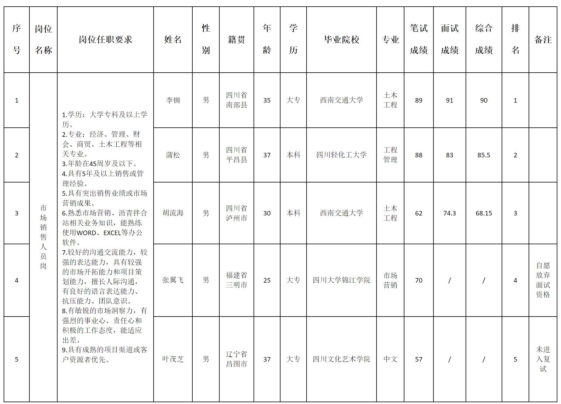 根據(jù)綿陽(yáng)交發(fā)大道新材料科技有限責(zé)任公司發(fā)布的招聘公告及招聘相關(guān)規(guī)定,經(jīng)筆試、面試等程序,現(xiàn)將成績(jī)予以公示。