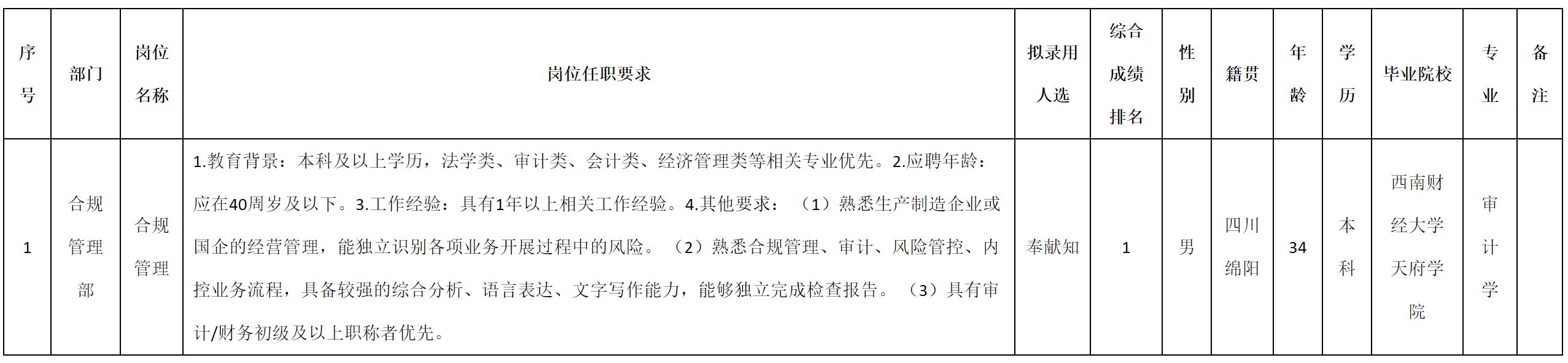 根據(jù)四川九州電子科技股份有限公司發(fā)布的招聘公告及招聘相關(guān)規(guī)定,經(jīng)測試、考察、體檢等程序,擬錄用奉獻知同志到四川九州電子科技股份有限公司工作,現(xiàn)予以公示,具體情況如下: